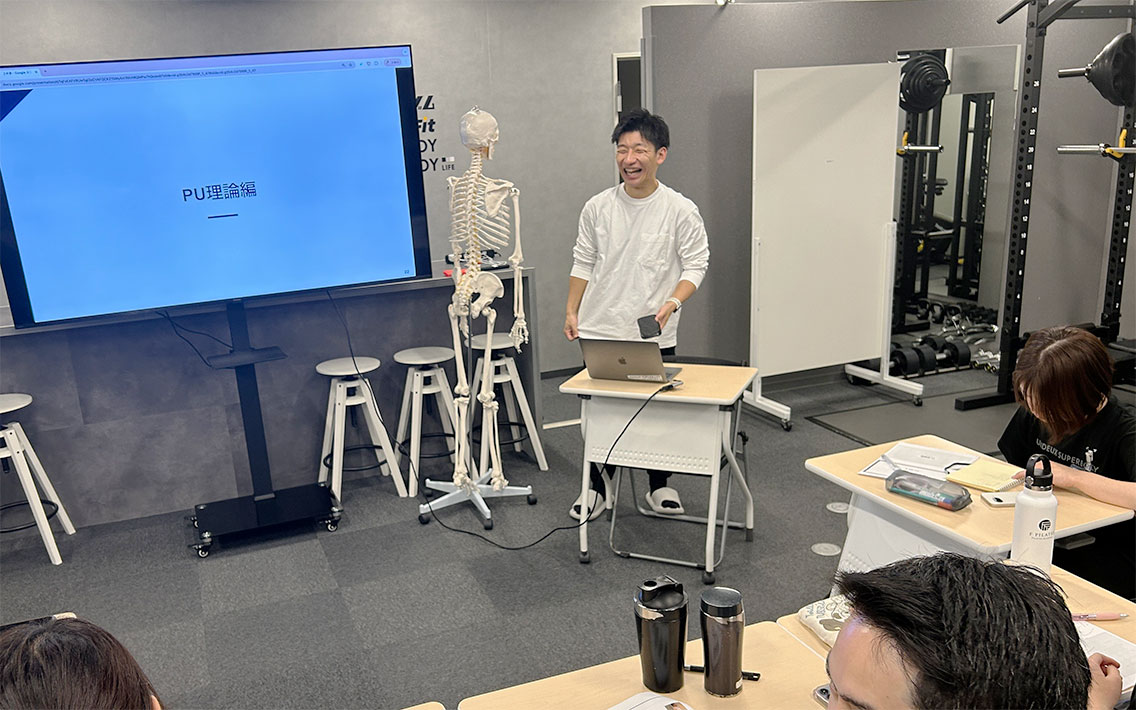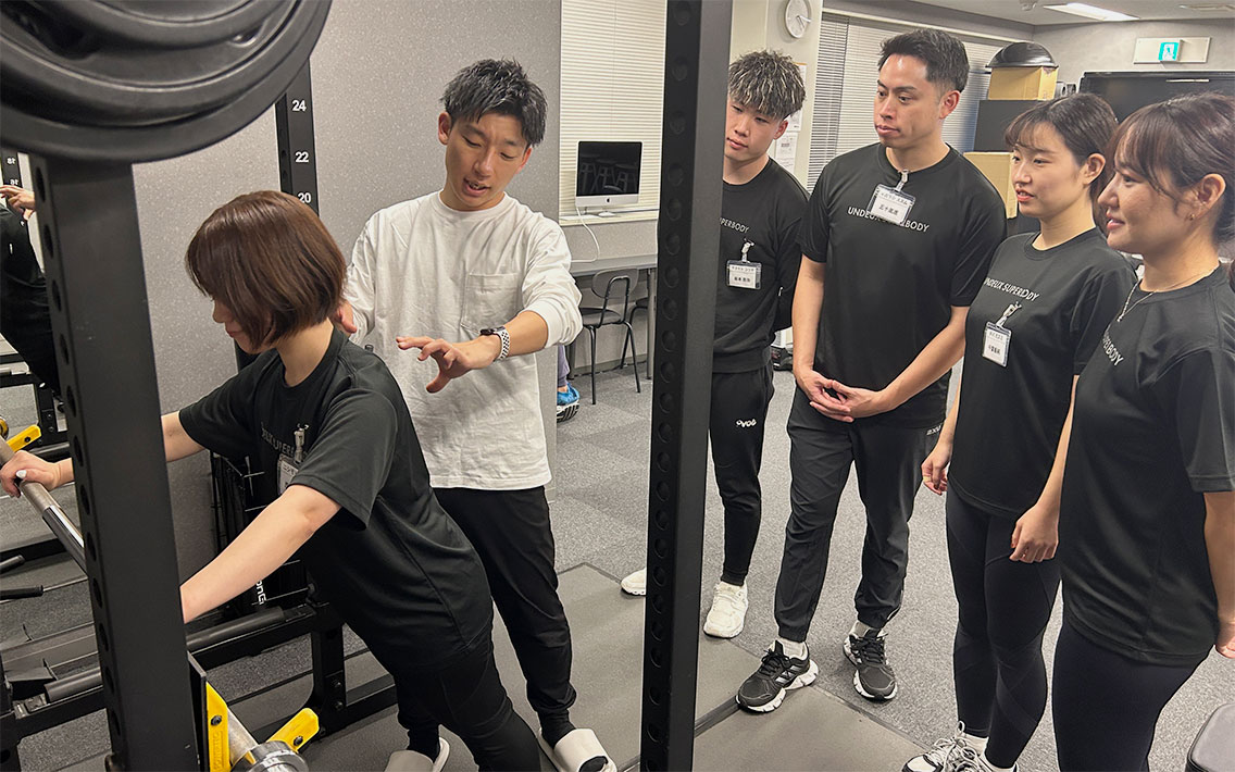 新人に対しては、解剖の基礎となる筋肉であったり体の動き方について。また弊社の基本種目と呼ばれる6つの種目についての理解度を深めるため、各種目のバイオメカニクスを交えて研修を実施。